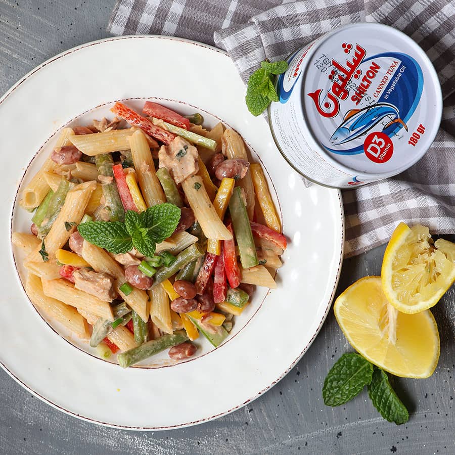 سالاد پاستا و ماهی تون دودی همراه با سس ریحان